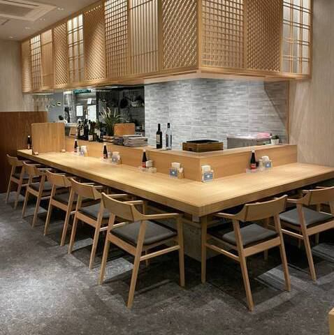 【職人の技を間近で】 カウンター席は、調理風景を眺められる特等席。料理人の繊細な手捌きや、食材の香りを間近に感じられるライブ感が魅力です。お一人様や、カップルでの親密なデートに最適。料理やお酒について、スタッフとの会話も楽しめます。五感で味わう贅沢な時間をお過ごしください。